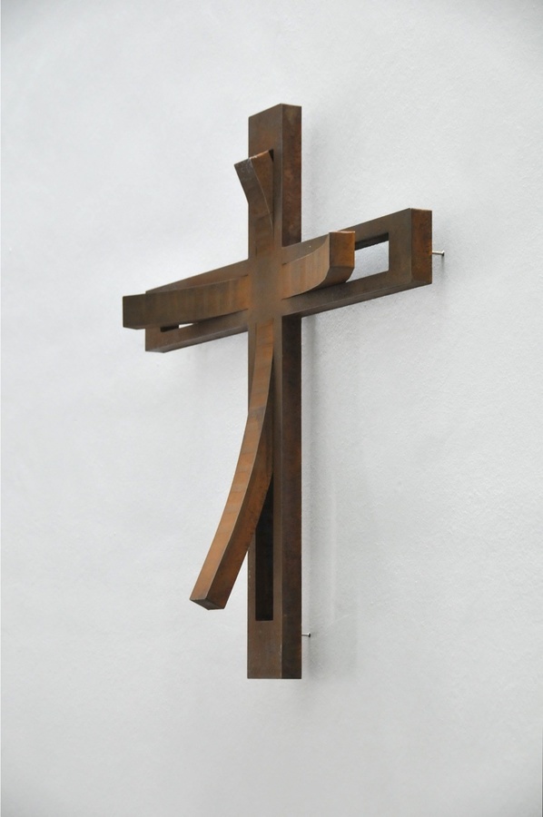 Das Aeternus-Kreuz ist ein ganz besonderes Kreuz. Der Bildhauer Hermann J. Kassel hat es als Doppelkreuz aus Stahl geschaffen. Aus dem Rahmenkreuz biegt sich das ausgeschnittene Innenkreuz körperähnlich hervor. Es ähnelt einem Kruzifix, aber wo der Lichtspalt zwischen Rahmen- und Innenkreuz sichtbar wird, zeigt sich die göttliche Heilsenergie andeutungsweise im hervorgebogenen Stahl.