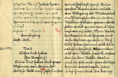 „Luther und Hitler sind zwei Männer, von denen das deutsche Volk noch nach Jahrhunderten mit Ehrfurcht spricht. Unser großer Reformator wurde am Ausgang des Mittelalter im thüringischen Lande, in dem Städtlein Eisleben geboren. Beide haben vieles gemeinsam. Luther sagt von sich selbst: ‚Mein Vater, Großvater und Ahnherr sind rechte Bauern gewesen.‘ Auch Adolf Hitler stammt aus bäuerlichem Geschlecht. Also mitten aus dem Volke heraus erstanden sie dem Volke. Darum sind sie fest mit ihrer deutschen Heimat verwurzelt. Jedoch auch ihnen blieb der Kampf ums Dasein nicht erspart. Hitler sowohl wie Luther standen noch schwere Kämpfe bevor. Schon als junger Mann verlor Hitler seine Eltern. Trostlos schaute er in die Zukunft. Es kam der Weltkrieg. Während Hitler gaserblindet im Spital, zu Pasewalk lag, mußte er hören, wie man gegen die Armee redete, und die Juden schon ganze Arbeit gemacht hatten. Die Hoffnungslosigkeit schlug ihn vollends nieder. Um diese Zeit war es Hitler zumute, als müsse er hervorspringen, und den deutschen Arbeiter vertreten. Es ist ihm, als ob seine Stunde geschlagen hätte. Mit 30 Jahren erkennt Hitler sein Ziel. ‚Wenn Gott einem Volke helfen will, so hilft er es [!] nicht durch Worte und Bücher, sondern durch einen Mann, der im Volke emporgewachsen ist.‘ Luther und Hitler sind zwei Männer, von denen die deutsche Geschichte jedes Jahrhundert nur einen aufweisen kann. Unser Reformator hatte nicht wenigeres zu bestehen. Was hatte er nicht alles im Kloster erleben müssen! Nur mit dem einen Gedanken beschäftigte er sich Tag und Nacht: ‚Wie werde ich selig?‘ Auch im Kloster erlangte er seiner Seelen Seligkeit nicht. Darum faßte er sich ein Ziel und dieses Ziel hielt er fest, nämlich: der Neubau der Kirche. Beide hatten eine Welt von Feinden. Sie wurden verfolgt und geächtet, verhöhnt und verspottet. Je mehr man sie aber verfolgte, desto mehr Anhänger bekamen sie. ‚Und wenn die Welt voll Teufel wär,‘ singt Luther in seinem: ‚Ein feste Burg ist unser Gott.‘ Hierdrin kennzeichnet sich der Mut und die Treue Luthers. Furchtlos und beharrlich hielten beide an ihrem Ziele, fest [gestrichen] durch Not und Gefahren hindurch, fest. Luther rechtfertigt sich auf dem Reichstage zu Worms: vor Kaiser und Reich, vor Papst und Kirche. Welch großes Unternehmen! Auch Adolf Hitler fürchtete sich vor Regierung und Festungshaft nicht. Er setzte sein Ziel durch bis zum siegreichen Ende. Was Hitler sich bis jetzt vorgenommen hatt ist ihm gelungen. Es wird ihm auch weiterhin gelingen. Die Weltanschauung Adolf Hitlers führt dahin, daß er eine große Volksgemeinschaft gründen will. Mit Hitler [gestrichen] Luther brach [gestrichen] endete die Zeit des Mittelalters und an ihr setzt sich die Neuzeit. Mit Hitler bricht die alte Weltanschauung, und mit ihm ersteht das dritte Reich. Unser Führer kämpft nicht für sich und seine Ehre, sondern für das deutsche Volk und dessen Ehre.“ [Zitiert nach Bernd Sösemann (Hg.), Propaganda. Medien und Öffentlichkeit in der NS-Diktatur, Beiträge zur Kommunikationsgeschichte, Bd. 25, Stuttgart 2010, Nr. 1168].