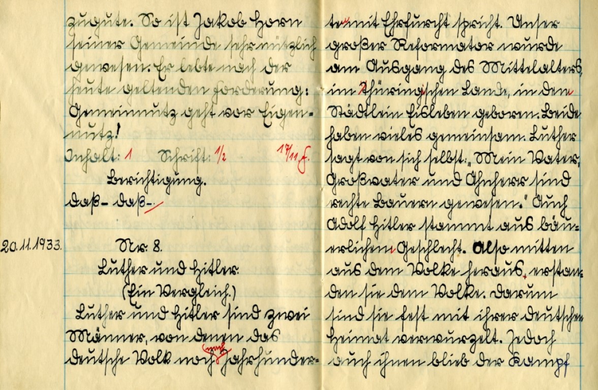 Luther und Hitler sind zwei Männer, von denen das deutsche Volk noch nach Jahrhunderten mit Ehrfurcht spricht. Unser großer Reformator wurde am Ausgang des Mittelalter im thüringischen Lande, in dem Städtlein Eisleben geboren. Beide haben vieles gemeinsam. Luther sagt von sich selbst: ‚Mein Vater, Großvater und Ahnherr sind rechte Bauern gewesen.‘ Auch Adolf Hitler stammt aus bäuerlichem Geschlecht. Also mitten aus dem Volke heraus erstanden sie dem Volke. Darum sind sie fest mit ihrer deutschen Heimat verwurzelt. Jedoch auch ihnen blieb der Kampf ums Dasein nicht erspart. Hitler sowohl wie Luther standen noch schwere Kämpfe bevor. Schon als junger Mann verlor Hitler seine Eltern. Trostlos schaute er in die Zukunft. Es kam der Weltkrieg. Während Hitler gaserblindet im Spital, zu Pasewalk lag, mußte er hören, wie man gegen die Armee redete, und die Juden schon ganze Arbeit gemacht hatten. Die Hoffnungslosigkeit schlug ihn vollends nieder. Um diese Zeit war es Hitler zumute, als müsse er hervorspringen, und den deutschen Arbeiter vertreten. Es ist ihm, als ob seine Stunde geschlagen hätte. Mit 30 Jahren erkennt Hitler sein Ziel. ‚Wenn Gott einem Volke helfen will, so hilft er es [!] nicht durch Worte und Bücher, sondern durch einen Mann, der im Volke emporgewachsen ist.‘ Luther und Hitler sind zwei Männer, von denen die deutsche Geschichte jedes Jahrhundert nur einen aufweisen kann. Unser Reformator hatte nicht wenigeres zu bestehen. Was hatte er nicht alles im Kloster erleben müssen! Nur mit dem einen Gedanken beschäftigte er sich Tag und Nacht: ‚Wie werde ich selig?‘ Auch im Kloster erlangte er seiner Seelen Seligkeit nicht. Darum faßte er sich ein Ziel und dieses Ziel hielt er fest, nämlich: der Neubau der Kirche. Beide hatten eine Welt von Feinden. Sie wurden verfolgt und geächtet, verhöhnt und verspottet. Je mehr man sie aber verfolgte, desto mehr Anhänger bekamen sie. ‚Und wenn die Welt voll Teufel wär,‘ singt Luther in seinem: ‚Ein feste Burg ist unser Gott.‘ Hierdrin kennzeichnet sich der Mut und die Treue Luthers. Furchtlos und beharrlich hielten beide an ihrem Ziele, fest [gestrichen] durch Not und Gefahren hindurch, fest. Luther rechtfertigt sich auf dem Reichstage zu Worms: vor Kaiser und Reich, vor Papst und Kirche. Welch großes Unternehmen! Auch Adolf Hitler fürchtete sich vor Regierung und Festungshaft nicht. Er setzte sein Ziel durch bis zum siegreichen Ende. Was Hitler sich bis jetzt vorgenommen hatt ist ihm gelungen. Es wird ihm auch weiterhin gelingen. Die Weltanschauung Adolf Hitlers führt dahin, daß er eine große Volksgemeinschaft gründen will. Mit Hitler [gestrichen] Luther brach [gestrichen] endete die Zeit des Mittelalters und an ihr setzt sich die Neuzeit. Mit Hitler bricht die alte Weltanschauung, und mit ihm ersteht das dritte Reich. Unser Führer kämpft nicht für sich und seine Ehre, sondern für das deutsche Volk und dessen Ehre.