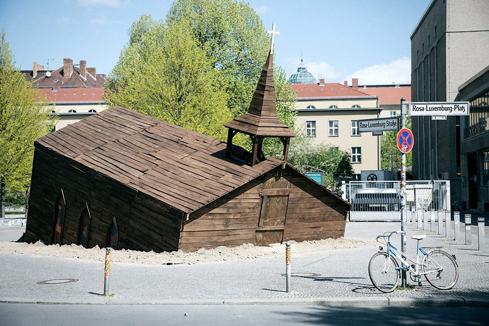 Da kann man den Kunstatheisten der Opernkompanie Novoflot nur gratulieren, die Ende April schlagzeilenträchtig am Rosa-Luxemburg-Platz in Berlin neben der Volksbühne ein versinkendes Holzkirchengebäude temporär errichtet hatten. Als Motto wurde dazu ein vermeintliches Luther-Zitat ausgegeben: „Wo Gott eine Kapelle baut, da baut der Teufel eine Kirche daneben.“ Im Original (Rörer-Nachschrift der Predigt vom 22.7. 1526 über Mt 7,15-23) heißt es umgekehrt: „Wo Gott eine Kirche baut, da baut der Teufel eine Kapelle daneben.“ (Mühlhaupt, Luthers Evangelien-Auslegung 2, Göttingen 1973, S. 237)