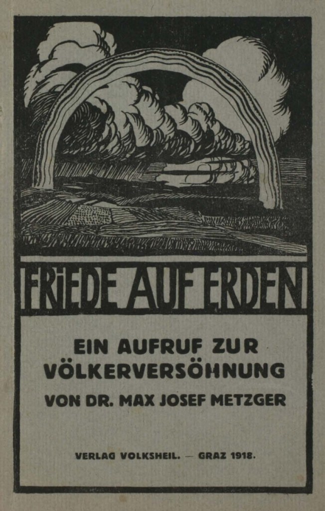 Aufgrund seiner Erfahrungen als Divisionspfarrer im Ersten Weltkrieg verfasste Max Josef Metzger 1917 die Broschüre „Rassenhaß oder Völkerfriede“, die folgendes Friedensprogramm enthielt: