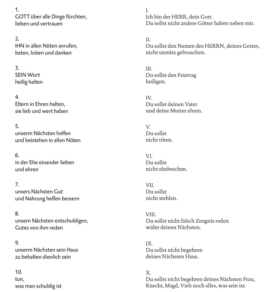 Bei der Neugestaltung unserer Außenanlagen um die Martin-Luther-Kirche werden zehn Stelen aufgestellt, die die Zehn Gebote mit positiven Weisungen verbinden. Dazu sind Luthers Erklärungen im Kleinen Katechismus auf prägnante Grundworte reduziert worden. Im Folgenden möchte ich diese Grundworte und deren Bedeutung für den christlichen Lebensweg sowie für das gesellschaftliche Zusammenleben kurz vorstellen: