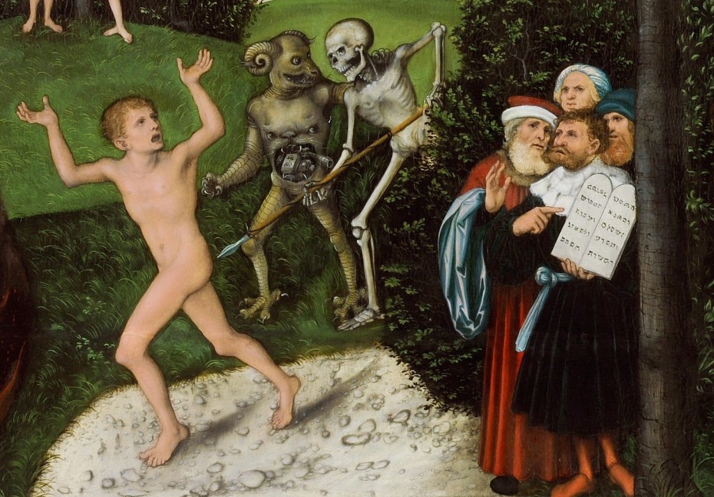 Was jüngst mit der anstößigen INSM-Anzeigen-Kampagne in Sachen „Zehn Gebote von Annalena Baerbock“ vorgeführt werden sollte, ist eine vermeintlich „mosaische“ Attitüde, anderen Menschen moralische Vorhaltungen zu machen. In Lucas Cranachs plakativem Gemälde „Gesetz und Gnade“ (1529, Herzogliches Museum Gotha) wird der sündige Mensch von Tod und Teufel ins Höllenfeuer gejagt, während er zu Mose (mit Hermelinkragen) blickt, der auf die beiden Gebotstafeln in seiner linken Hand verweist. Was in Cranachs Gemälde mit den zwei Bildhälften „Gesetz“ und „Gnade“ auf einen rettenden Transitus zu Christus hin angelegt ist, kann in einer säkularisierten Gesellschaft nicht länger nachvollzogen werden. Es bleibt bei den Vorhaltungen, denen man sich zu entziehen sucht.