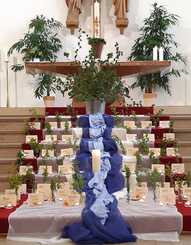 Heute beim Gedenkgottesdienst für die Verstorbenen des Benild-Hospizes in der Kollegskirche in Illertissen sind die Worte aus dem Buch der Offenbarung eindrücklich visualisiert worden: „Und der Engel zeigte mir einen Strom, das Wasser des Lebens, klar wie Kristall; er geht vom Thron Gottes und des Lammes aus. Zwischen der Straße der Stadt und dem Strom, hüben und drüben, steht ein Baum des Lebens. Zwölfmal trägt er Früchte, jeden Monat gibt er seine Frucht; und die Blätter des Baumes dienen zur Heilung der Völker.“ (Offb 22,1-2)