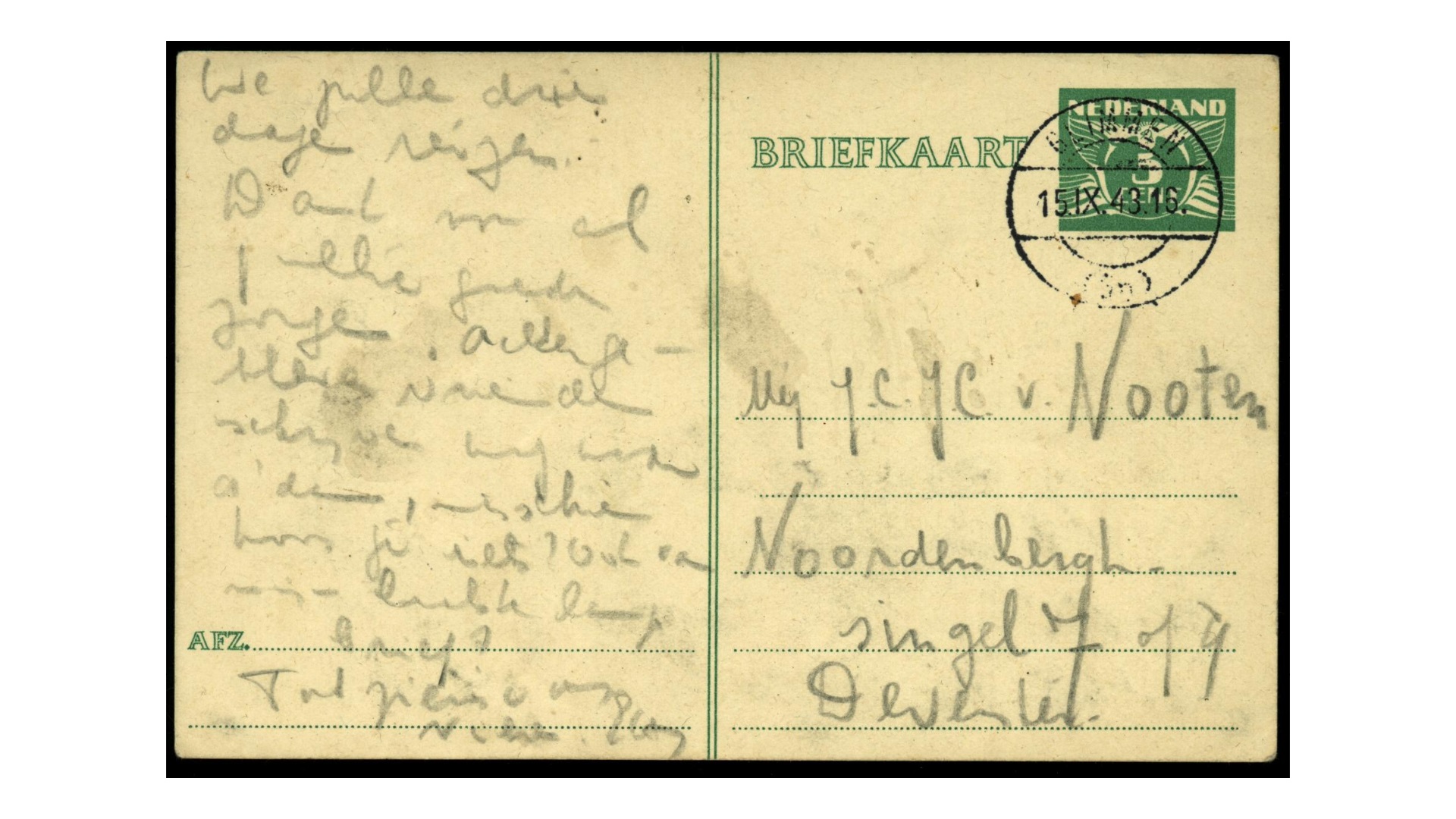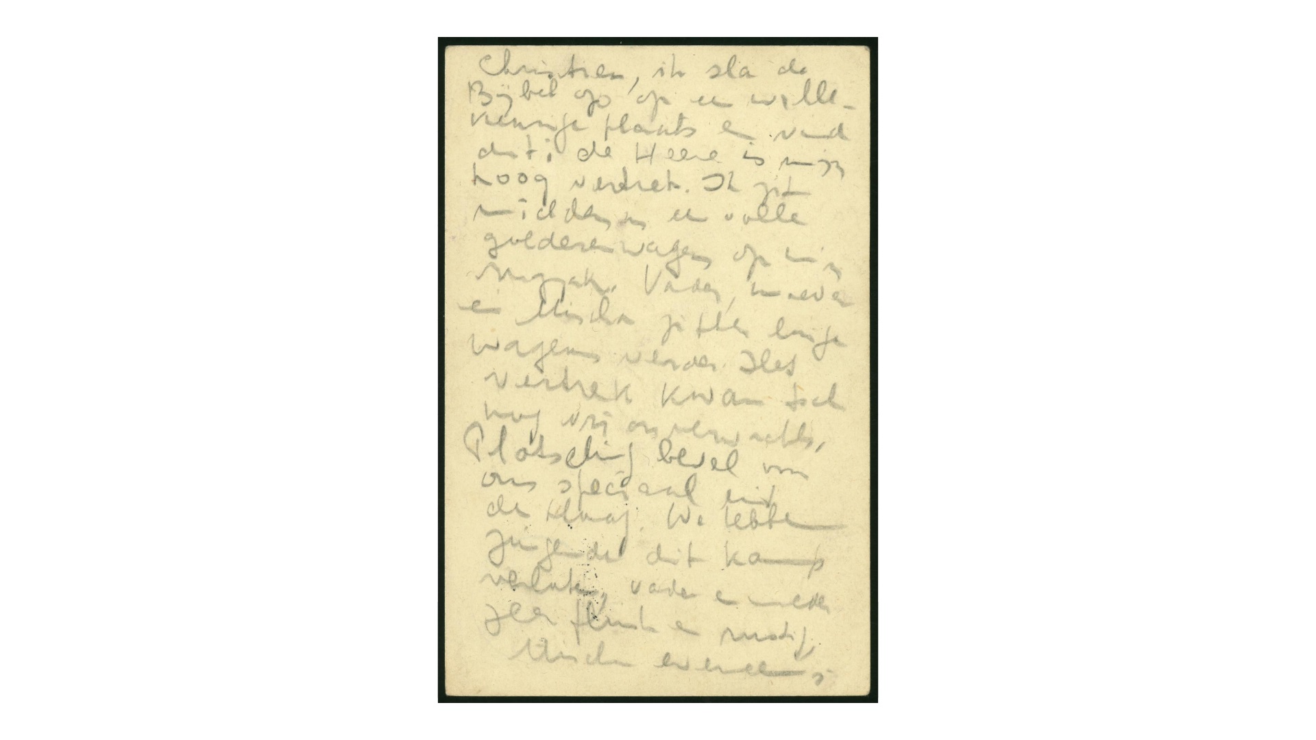 ich öffne die Bibel an einer zufälligen Stelle und finde dies: Der Herr ist meine hohe Zuflucht [Psalm 62,3?]. Ich sitze mitten in einem vollen Güterwagen auf meinem Rucksack. Vater, Mutter und Mischa sitzen einige Wagen weiter. Die Abfahrt kam doch noch recht unerwartet. Plötzlich Befehl speziell für uns aus Den Haag. Wir haben das Lager singend verlassen, Vater und Mutter sehr ordentlich und ruhig, Mischa ebenso. Wir werden drei Tage reisen. Dank für all eure guten Sorgen. Zurückgebliebene Freunde schreiben noch nach Amsterdam, vielleicht erfahrt ihr etwas? Auch von meinem letzten langen Brief?