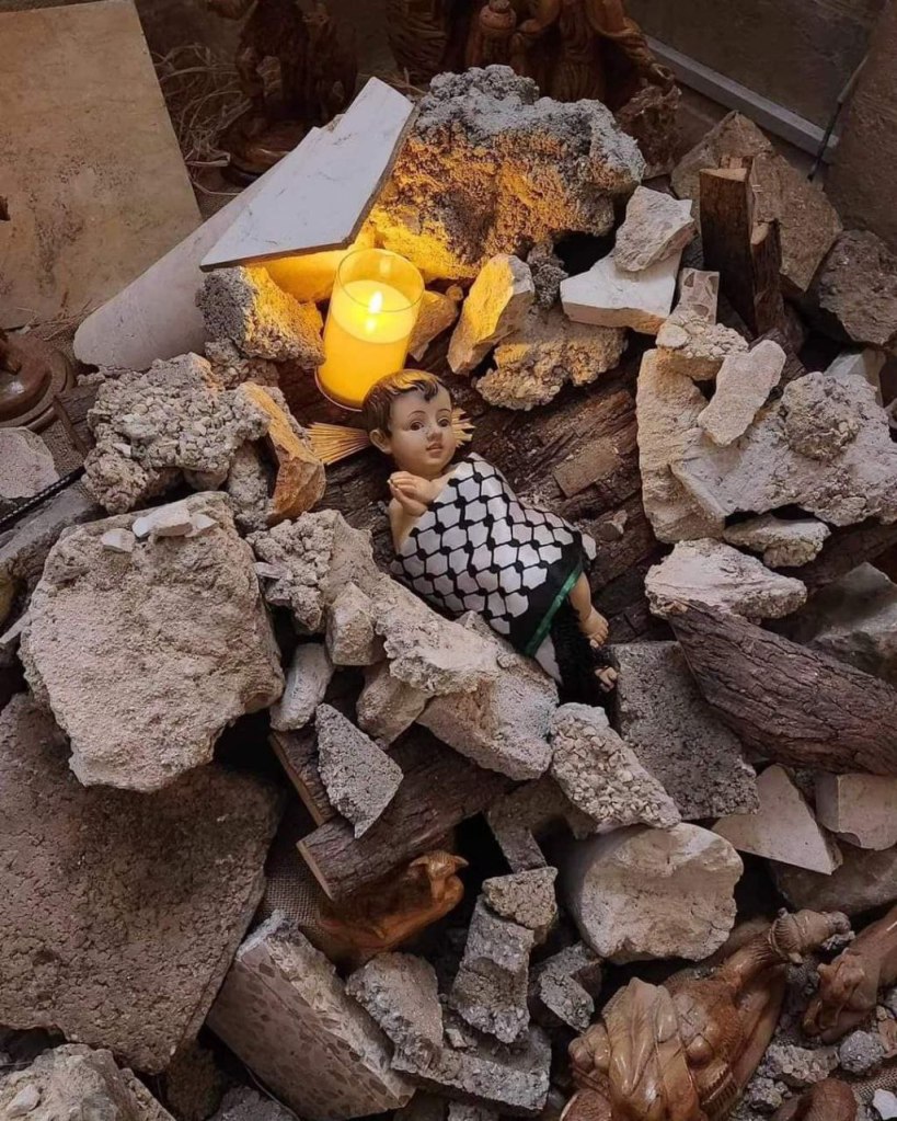 Aus Anlass des aktuellen Israel-Gaza-Kriegs hat die evangelisch-lutherische Gemeinde der Weihnachtskirche in Bethlehem die Weihnachtskrippe Jesu (nativity scene) in einer Trümmerlandschaft dargestellt. Parteisch wirkt die schwarz-weiße Kufiya, in die das Jesuskind eingewickelt ist. Pastor Munther Isaac will auch das so verstanden wissen.