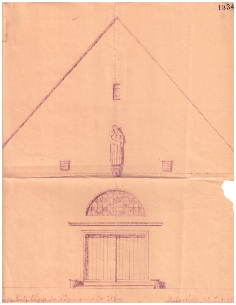 Am 4. März 1934 machte ich dieserhalb ein Gesuch an das Bezirksamt Illertissen um Befürwortung und Weiterleitung an die zuständige Behörde. Zur Aufklärung diene Folgendes: Die im Rohbau fertige Kirche hat, wie Sie in beiliegender Karte ersehen können, keinen architektonischen Schmuck.