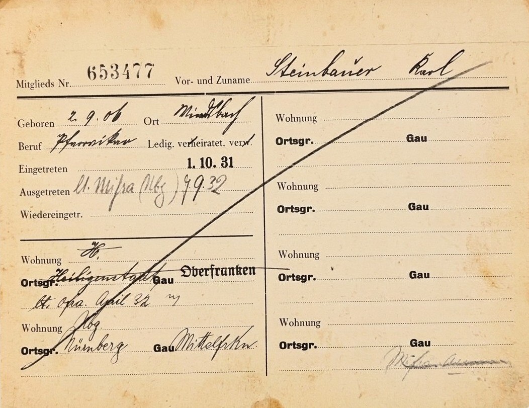 Das ist sie, die NSDAP-Mitgliedskarte von Pfarrer Karl Steinbauer (1906-1988), eingetreten am 1.Oktober 1931 in die Ortsgruppe Heiligenstadt in Oberfranken und ausgetreten am 7. September 1932. In seinem Buch „Einander das Zeugnis gönnen“, Band 1, schreibt er ganz offen darüber, in welcher völkischer und antisemitischer Nähe zum Nationalsozialismus er sich bis anfangs der dreißiger Jahre befunden hatte. Und er weiß folgende Geschichte zu erzählen, wie er sich vor der Machtergreifung vom Nationalsozialismus gelöst hatte:
