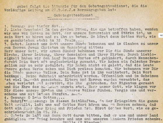 Erklärung der Kirchlich-Theologischen Sozietät zum Gebetsgottesdienst der Vorläufigen Leitung der DEK: „Die Gemeinde handelt darum nach Gottes Wort, wenn sie nach dieser GO in drohender Kriegsnot bittet, Gott wolle den Krieg von uns abwenden und den Regierenden in allen Völkern das Herz lenken, daß sie ihre Völker zum Frieden regieren.“