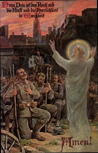Hirtenbrief des bayerischen Oberkonsistoriums „an seine Pfarrer, Hilfsgeistlichen und exponierten Vikare“ zur Fortsetzung der Kriegsanstrengungen im 1. Weltkrieg (1916): „So wie das deutsche Volk nach seiner Gemütsanlage weit entfernt ist von der maßlosen Gewinnsucht wie von der rasenden Ehrsucht seiner Feinde und nur widerstrebend in diesen Krieg eingetreten ist, kann es ja gar nicht anders, als im tiefsten Grund ein Grauen empfinden vor dem furchtbaren Werk, das ihm aufgenötigt ist … Dieses Gefühl konnte geradezu gefährlich werden, wenn es sich mit religiösen Vorstellungen verband etwa derart, dass der christliche Sinn das Blutvergießen nicht länger gutheißen könne, dass die christliche Selbstlosigkeit es erlaube, wenn nicht fordere, auf eine volle Sühne des an uns verbrochenen Unrechts zu verzichten, und dergleichen.“