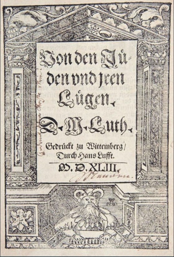 Martin Luthers furchtbarer Aufruf zum Judenpogrom in seiner Schrift „Von den Juden und ihren Lügen“ (1543): „Zum andern, dass man auch ihre Häuser desgleichen zerbreche und zerstöre. […] Dafür mag man sie etwa unter ein Dach oder Stall tun wie die Zigeuner, auf dass sie wissen, sie seien nicht Herren in unserem Lande, wie sie rühmen, sondern im Elend (= Ausland) und gefangen, wie sie ohne Unterlass vor Gott über uns Zeter schreien und klagen.“