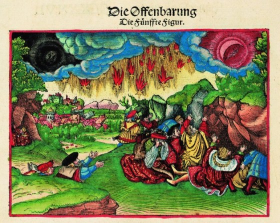 Friedrich Dürrenmatt, Zu den Teppichen von Angers (1951): „Der fromme Glaube, der die Teppiche von Angers schuf, wissend um die Vergänglichkeit der Welt und dennoch ohne Verzweiflung, da es für ihn, noch wirklicher als der Tod, die Auferstehung gab und das selige Erwachen der Christen auf einer neuen Erde und in einem neuen Himmel nach den Schrecken der Apokalypse, hat einer Angst Platz gemacht, für die das Jüngste Gericht nur noch das Ende bedeutet, eine schauerliche Götterdämmerung der Zivilisation, der, dank der Atombombe, das Nichts folgen soll, das sinnlose Kreisen eines ausgebrannten Planeten um eine gleichgültig gewordene Sonne.“