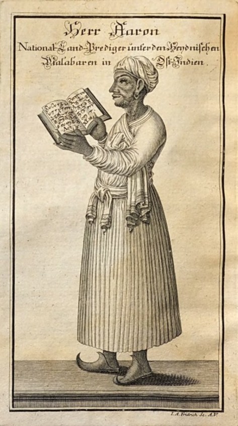 Daniel Cyranka und Andreas Wenzel über Conrad Daniel Kleinknecht und dessen Werbung für die Indienmission: „Im Jahr 1739 wandte sich Kleinknecht mit der Bitte an Gotthilf August Francke, endlich auch ein Bild von Aaron zu veröffentlichen, das für viele Menschen ‚erwecklich sein konnte‘: ‚Mir wurde schon mehrfach mündlich und auch schriftlich von lieben Freunden zugetragen, dass sie, nachdem sie so viel Erbauliches über den ersten Nationalprediger, Herrn Aaron, gelesen hatten, den Wunsch äußerten, sein Porträt zu sehen. Ich würde mich gerne darum bemühen, dass er in seinem priesterlichen Gewand in Kupfer gestochen wird: Das würde für manchen erwecklich sein. Ich würde gerne Euer Hochwürden Bedenken hierzu hören. Einen Künstler in Augsburg wüsste ich bereits, der ihn kostenlos in Kupfer stechen würde.'“