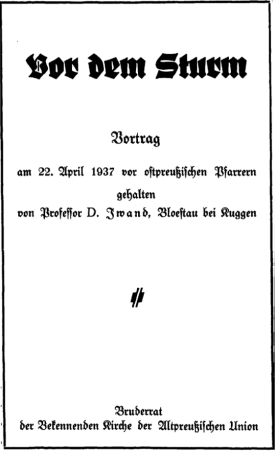 Hans Joachim Iwands Vortrag Vor dem Sturm (Die Stunde des Abfalls, 1937): „Die Heilige Schrift hat uns nie im Unklaren darüber gelassen, dass das antichristliche Heidentum, das am Ende der Tage auftreten wird, ein anderes Gesicht hat, als das Heidentum, dem das Christentum in der Fülle der Zeit begegnete. Denn während damals offene Türen die Boten des Evangeliums einließen, verrammelt am Ende der Tage das durch das Christentum hindurchgegangene Heidentum seine Türen, um den nicht einzulassen, der kommt. Es ist die letzte Anstrengung der Mächte, die wissen, dass die Ankunft des Herrn das Ende ihrer Herrschaft bedeutet, und die darum — ohne es zu wollen — der leidenden und kämpfenden Gemeinde damit ein Zeichen geben: Der Herr ist nahe.“