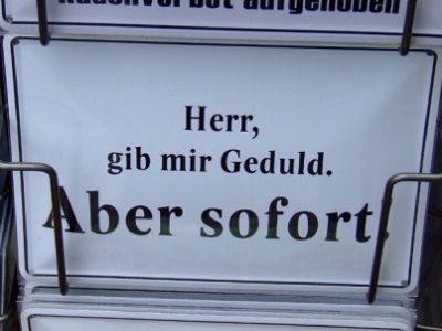 Ein Geduldsgebet (Gebet für die eigene Geduld): „Schenke mir Geduld mit meiner Ungeduld. Deine Geduld möchte ich haben; ich brauche sie wie das tägliche Brot, um auszuhalten, was über meine Geduld geht.“