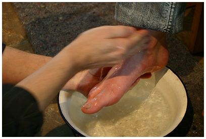 Fußwaschung im Gottesdienst an Gründonnerstag: „Ich nehme für jedes zu waschende Gemeindeglied eine eigene Wasserschüssel und lege mir ein separates Handtuch auf die Schulter. Ich knie vor jedem Teilnehmer, nehme nacheinander beide Füße in die linke Hand und halte sie jeweils über die Schüssel. Ich beträufle Fuß und Knöchel mit warmem Wasser und streiche das Wasser mit der rechten Hand über dem jeweiligen Fuß ab. Anschließend trockne ich den Fuß mit dem Handtuch und wische schließlich die Wasserpfütze vor dem jeweiligen Stuhl auf. So gehe ich der Reihe nach vor.“