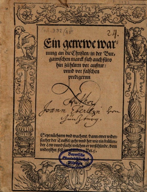 Johann Eberlin von Günzburg, Eine getreue Warnung an die Christen der Burgauischen Mark, sich auch forthin zu hüten vor Aufruhr und vor falschen Propheten (1526): „Nun schreibe ich diesen Brief nur an diejenigen, die am vorherigen Aufruhr keinen Anteil hatten und Gott dafür loben, dass er sie behütet hat, und die auch geneigt sind, dem Wort Gottes mehr zu folgen als aller menschlichen Klugheit in Liebe und in Leid. Diese will ich hiermit warnen vor dem Pfeil, der bei Tag fliegt, vor der Pest, die im Dunkeln schleicht, vor der Seuche, die am Mittag verderbt, Psalm 90. Und da ich sie für unschuldig halte, achte ich sie auch für unbeschädigt, weshalb ich keinen Trostbrief schreibe.“