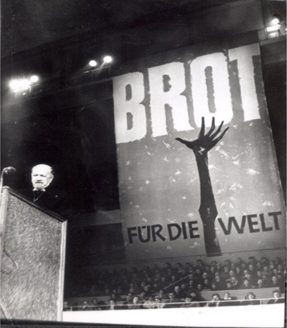 Helmut Gollwitzers Rede zur ersten Aktion „Brot für die Welt“ von 1959: „Wer den Notleidenden nur Evangelium bringt und nicht zugleich damit tätige Hilfe aus eigenem Opfer, der macht aus dem Evangelium fromme Sprüche und verschuldet, daß die anderen dann ebenfalls meinen, das Evangelium sei nichts anderes als ein frommer Schwindel im Interesse der Besitzenden.“