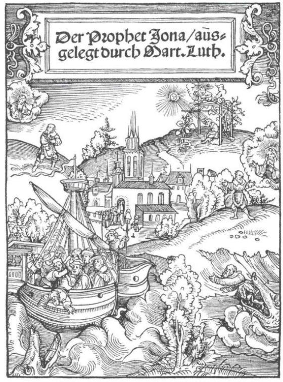 Martin Luther, Der Prophet Jona. Drei geistliche Deutungen: „Da stirbt nun Jona drei Tage und Nächte im Walfisch. Das ist, der Sünder liegt in solchem Schrecken und Todesnöten und ringt mit dem Tode, bis er ganz verzweifelt. Danach kommt das lebendige Gotteswort, das Evangelium der Gnade, und spricht zum Fische, das ist, es gebietet dem Tode, dass er den Menschen lebendig lasse. Da fängt der Glaube an und der Mensch wird sowohl von Sünden als auch vom Tode ledig und los und lebt somit in Gnade und Gerechtigkeit mit Christus.“