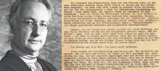 Elisabeth Schmitz, Denkschrift „Zur Lage der deutschen Nichtarier“ von 1935/36 (vollständiger Text): „Einer Judenverfolgung im Namen von Blut und Rasse muss eine Christenverfolgung notwendigerweise folgen. Einen Anfang davon hat die Bekennende Kirche, haben vor allem ihre Pfarrhäuser zu spüren bekommen. Aber trotz alles Leides wird es niemand einfallen, es in einen Vergleich setzen zu wollen zu dem Leid der deutschen Juden und Nichtarier. Und ganz abgesehen von der Größe des Leides bleibt der große Unterschied: Der Christ leidet persönlich, der Jude und Nichtarier mit Kindern und Enkeln. Und selbst wenn die Glieder der Bekennenden Kirche unter die Ariergesetzgebung gestellt würden, wären noch immer die Verwandten, die weitere Familie nicht mitbetroffen. Und die Hauptsache: Die Bekennende Kirche leidet – und darf das wissen – um ihres Glaubens willen, der Nichtarier wird verfolgt, weil Gott ihn in eine bestimmte Familie hat hineingeboren werden lassen.“