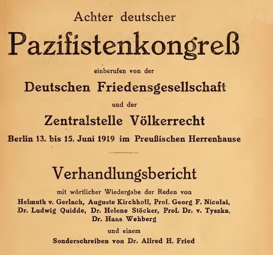 Max Josef Metzger 1919 auf dem »Achten Deutschen Pazifistenkongress« in Berlin: „Die Friedensbewegung muß das System der internationalen Diplomatie, den Machiavellismus überwinden, als ethischen Grundsatz aufstellen, dass das gleiche Sittengesetz gilt für die Beziehungen der Völker wie der einzelnen Menschen, dass Gerechtigkeit und Wahrhaftigkeit auch im Verhältnis der Völker zueinander sittliche Pflicht ist.“