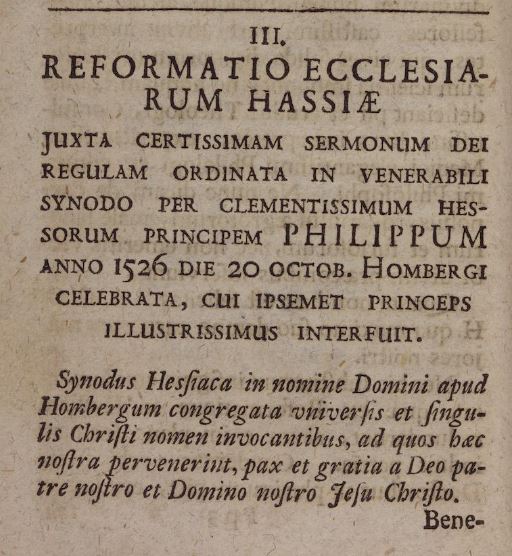 Reformation der hessischen Kirchen (Reformatio Ecclesiarum Hassiae) – Kirchenordnung, die im Anschluss an die Homberger Synode vom 20. Oktober 1526 erstellt wurde: „Deshalb ordnen wir an, dass in jeder Pfarrei, nachdem das Wort des Herrn eine Zeit lang gepredigt wurde, an jedem Sonntag nach der Messe oder dem Mittagessen eine Versammlung der Gläubigen an einem geeigneten Ort abgehalten werden soll, zu dem alle Männer, die die Sache Christi unterstützen und zu den Heiligen gezählt werden, sich versammeln, um gemeinsam mit dem Bischof über alle Dinge zu entscheiden, die in der Kirche behandelt werden müssen. Es ist nicht erlaubt, in solchen Versammlungen profane Dinge zu tun, um die Kirche Gottes zu verachten. Frauen können zwar an dieser Versammlung teilnehmen, aber ihnen ist es nicht erlaubt, in der Kirche zu sprechen. Nur Männer sollen Entscheidungen treffen.“