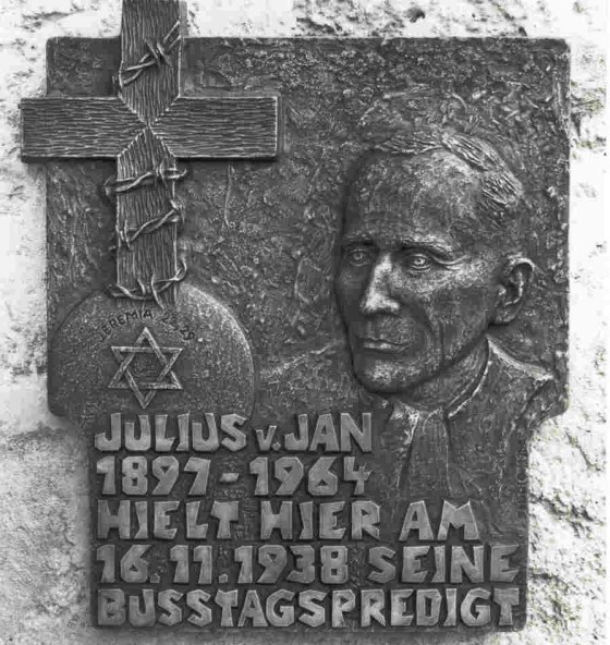 Julius von Jans Bußtagspredigt über Jeremia 22,29 vom 16. November 1938: „Wir haben die Quittung bekommen auf den großen Abfall von Gott und Christus, auf das organisierte Antichristentum. Die Leidenschaften sind entfesselt, die Gebote Gottes missachtet. Gotteshäuser, die anderen heilig waren, sind ungestraft niedergebrannt worden.“