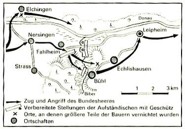 Jörg Truchsess an den Schwäbischen Bund in Ulm zur Schlacht bei Leipheim (4. April 1525): „Da ich das Gelände zuvor erkundet hatte, griff ich mit meinen Reitern und den Truppen aus Metz, die an diesem Tag den Vortritt hatten, an. Als wir in Richtung Leipheim auf das Feld vorrückten, trafen wir auf zwei Fähnlein, die von Günzburg zur Unterstützung der Bauern entsandt worden waren. Zusammen mit diesen sowie den fliehenden Bauern lieferten wir uns ein Gefecht, töteten einige Hundert von ihnen, indem wir sie ertränkten oder erstachen, und trieben weitere in die Auen, wohin unsere Reiter ihnen nicht folgen konnten. Deshalb warteten wir auf die Fußsoldaten, die sie später ebenfalls töteten und dann an das Wasser trieben.“