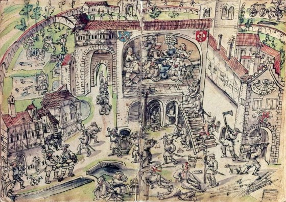 Zur Schlacht bei Leipheim 1525. Aus dem Tagebuch des Herolds Hans Lutz: „Und sobald der wohlgeborene Herr Jörg der Feind ansichtig ward, da ließ er ein Lärmen schlagen und seinen Trompeter Lärmen blasen. Da machte man die Ordnung zu Ross und zu Fuß, und fiel Herr Jörg über die Bauern mit seinem Leibfähnlein und mit dem Rennfähnlein. Und Herr Jörg jagte den Bauern das steinerne Kreuz ab und schrie mit lauter Stimme: „All mir nach!“ Er gewann den Bauern den tiefen Weg ab, und gab ihm Gott das Glück, dass er die Bauern schlug (Gott sei Lob und Ehr gesagt), und nahm den Bauern 4 Falkonettlein, und ist mir recht, auch 4 Fähnlein. Und schlug tot mehr denn 2000 Bauern, und ertranken der Bauern selber in der Donau bei 1500.“