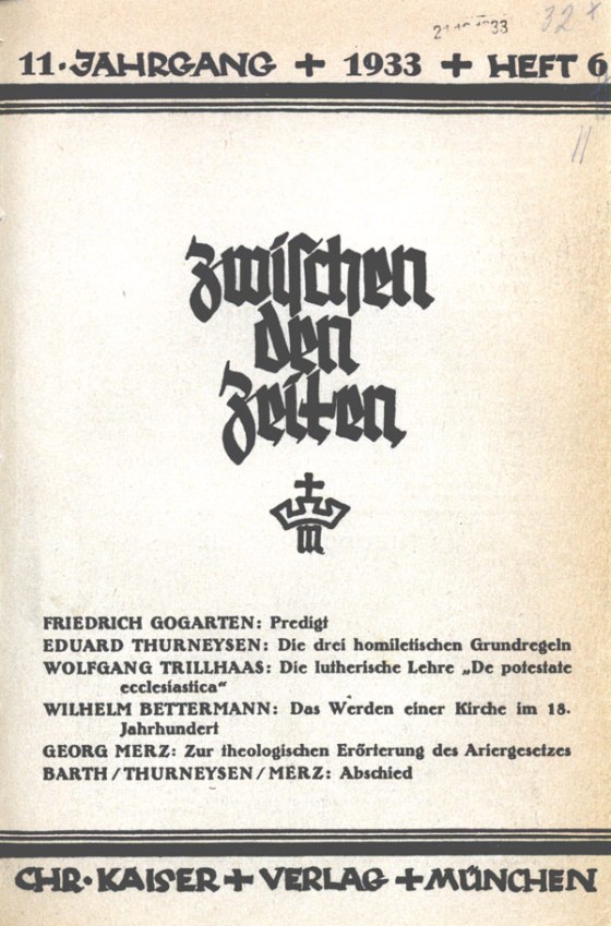 Karl Barths Abschied von „Zwischen den Zeiten“: „Es hätte keinen Sinn mehr, sondern es könnte die theologische und kirchliche Öffentlichkeit nur noch irreführen und verwirren, wenn wir fernerhin nach außen eine Gruppe und Front darstellen wollten.“